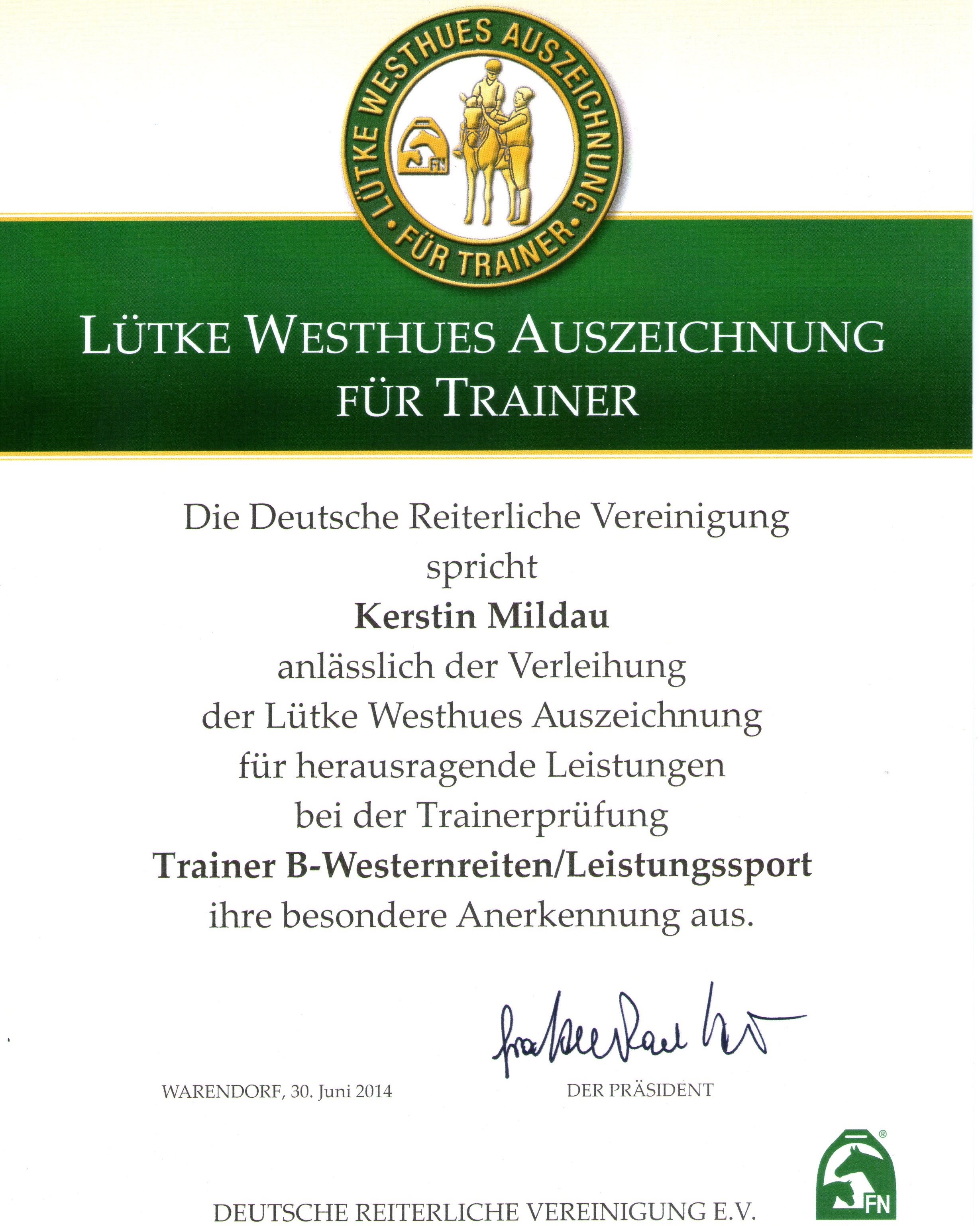 1989 Großes Reitabzeichen in Bronze der FN 1998 Reitabzeichen in Bronze der EWU 2009 Ausbildung zum Trainer C Westernreiten /Leistungssport 2010 Reitabzeichen in Silber der EWU 2010 Prüfung zum EWU Ringsteward 2012 Prüfung und Berufung zum EWU Steward 2013 Ausbildung zum Trainer B Westernreiten/Leistungssport 2014 Lütke-Westhues-Auszeichnung für herausragende Leistung bei der Trainerprüfung. Darüber freue ich mich ganz besonders :o)